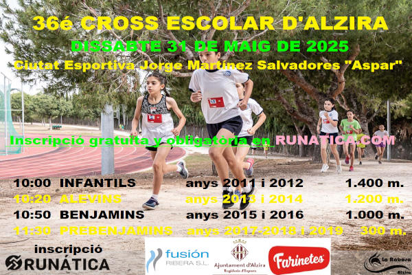 AVISO: Únicamente podrán inscribirse y participar escolares matriculados en algún centro de Alzira o nacidos en Alzira entre los años 2011 y 2019, ambos inclusive. Los escolares que sean de Alzira pero que estudien fuera, tendrán derecho a trofeo si quedan entre los tres primeros/as, aunque no puntuarán para ningún colegio.